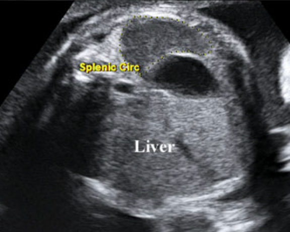 上腹部横切面于胃泡后方显示等回声弯月形脾脏回声,描记法测量脾周长